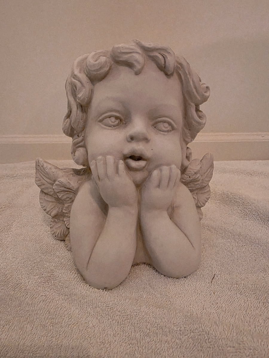 This charming handmade statue depicts a toddler angel gently lying on his belly. Resting his delicate chin in his tiny hands, he gazes forward with a peaceful, dreamy expression. His chubby cheeks and curled hair add to the innocence and warmth of the design. Crafted with fine attention to detail, the statue captures the serene beauty of childhood and the quiet wonder of angelic presence. Perfect for nurseries, memorials, or as a heartfelt gift, this angel radiates comfort, purity, and joy.