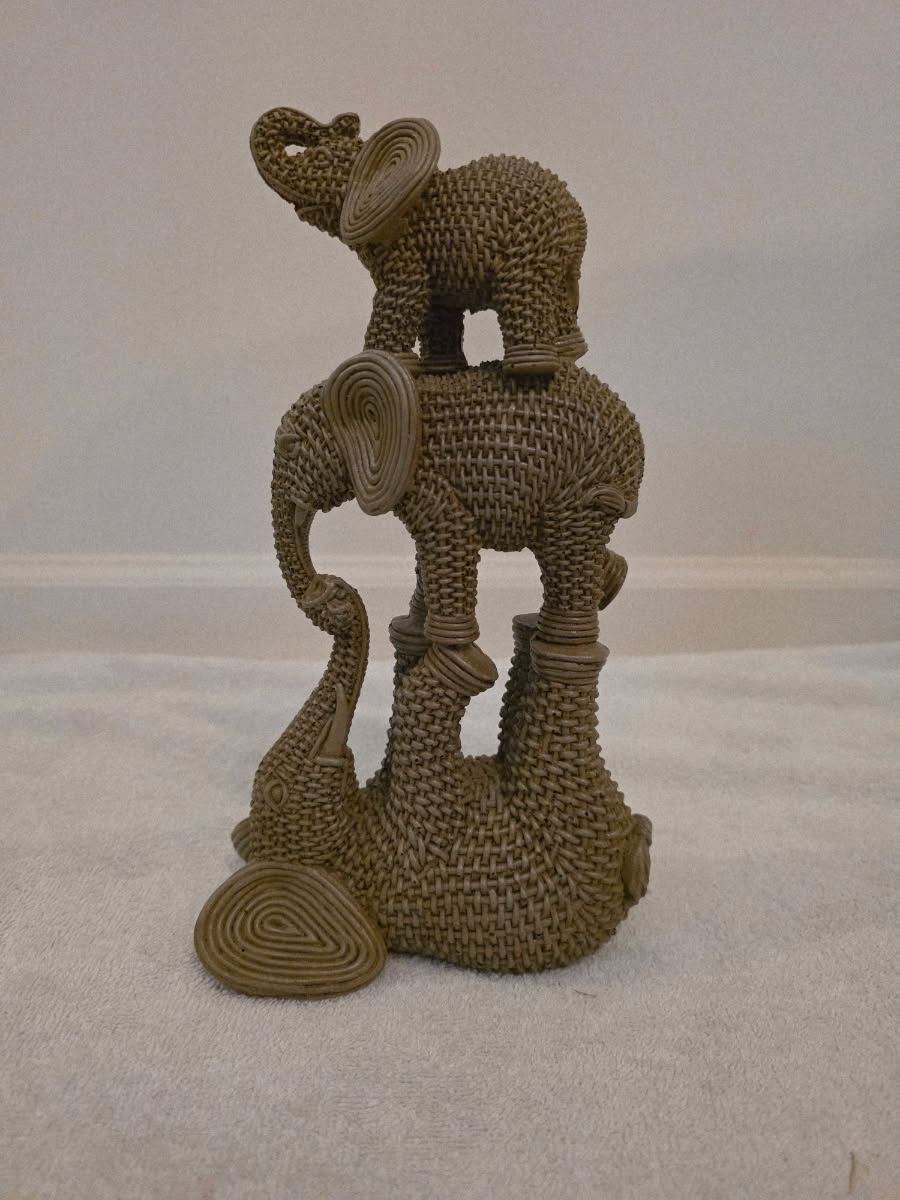 This exquisite handmade statue captures a heartwarming scene of familial unity and strength, sculpted with remarkable craftsmanship in rich, earthy brown tones. Three elephants—father, mother, and baby—are gracefully balanced atop one another, forming a majestic tower of love and support. At the base stands the proud and sturdy father, his powerful frame carved with lifelike detail, grounding the sculpture with a sense of wisdom and protection. Gently poised on his feet, the mother exudes grace and nurturing presence, her form slightly smaller yet equally detailed, embodying warmth and balance. At the very top sits the playful baby elephant, its tiny trunk raised in delight, symbolizing innocence and the joy of new beginnings. Each curve and contour of the statue is carefully shaped by hand, making it not just a decorative piece, but a timeless celebration of family, harmony, and enduring connection.